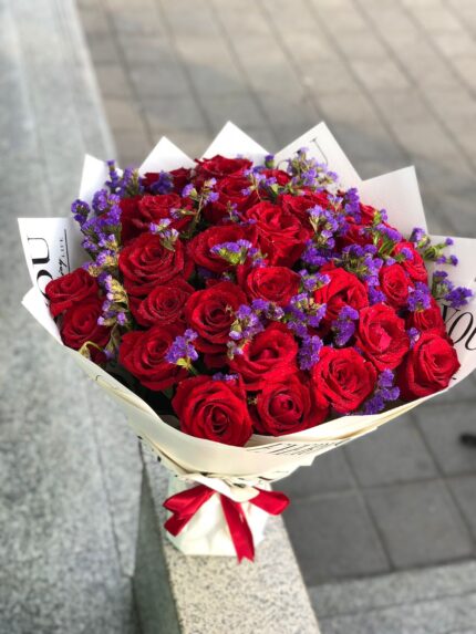 50 red roses with wrapping and card
